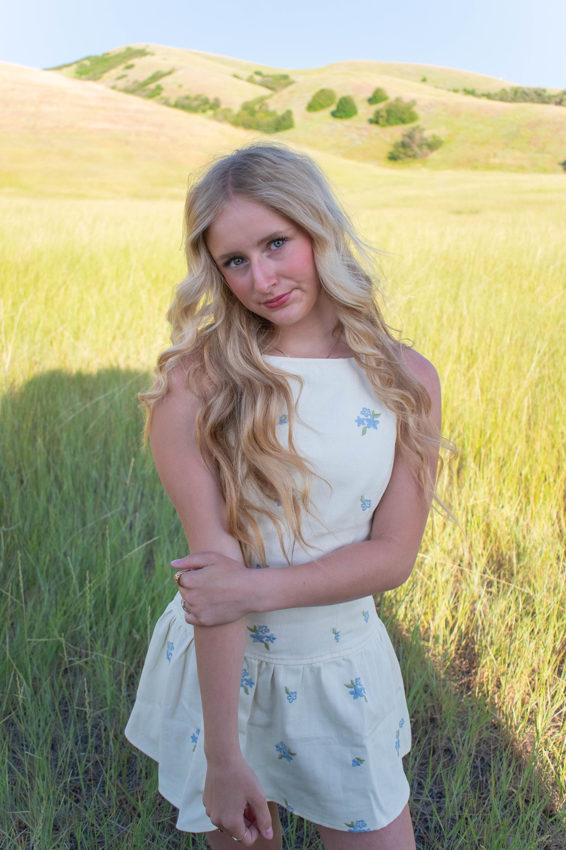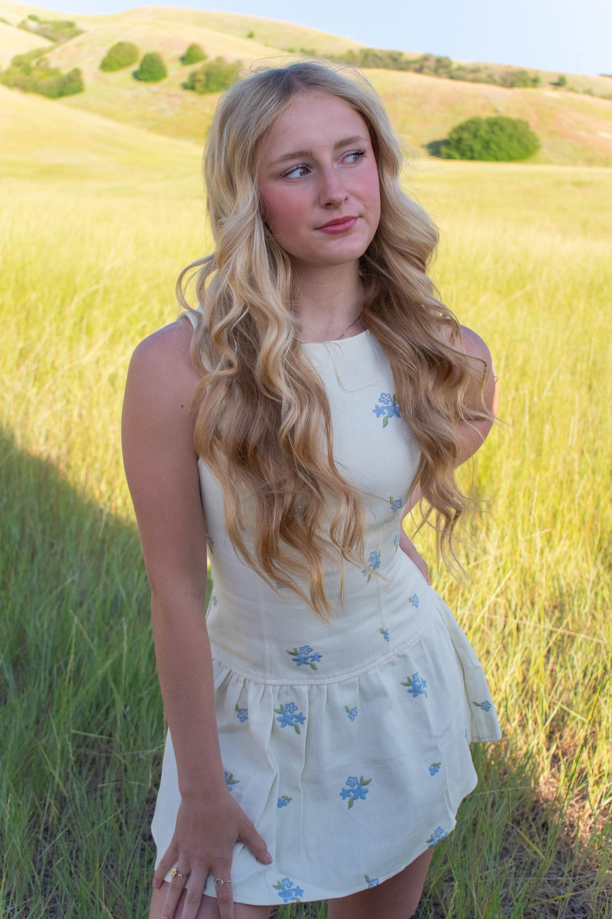 This summer-ready dress features a creamy denim texture adorned with charming blue embroidered flowers, making it a fun and fresh choice for sunny days.