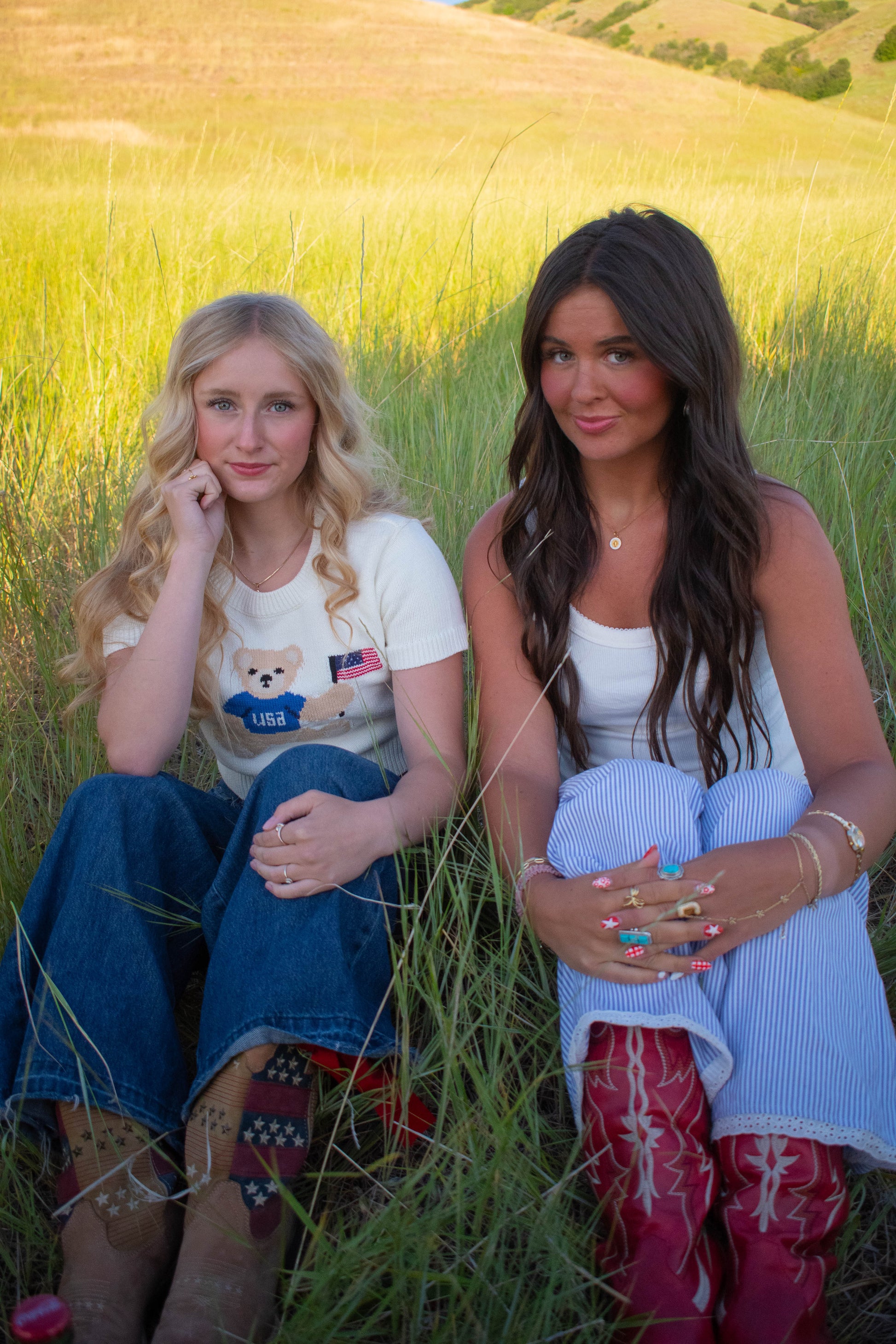 Celebrate the Fourth of July in style with this playful cream crop knit top featuring an adorable bear proudly holding the USA flag. Its cozy knit fabric and fun design make it the perfect festive addition to your summer wardrobe.